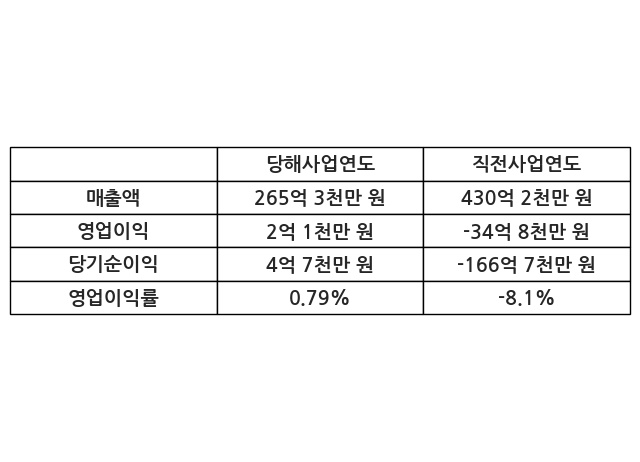 이번사업연도의 매출액은 직전사업연도 대비 -38.32% 감소한 265억 3천만 원, 영업이익은 2억 1천만 원, 당기순이익은 4억 7천만 원이라고 공시했다.
