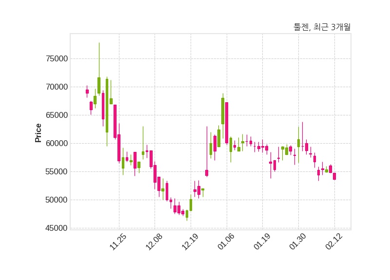 한편, 툴젠은 장 마감 이후 해당 기업공시를 발표했으며 오늘 종가가 53,600원, 거래량은 20,596주로, 직전 거래일 대비 1,200원(-2.19%) 하락했다.