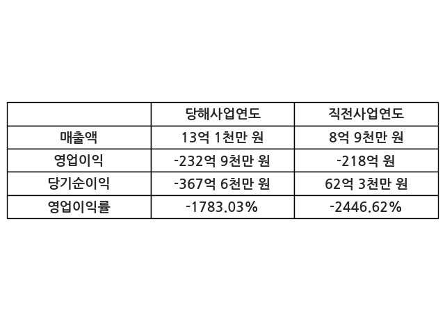 이번사업연도의 매출액은 직전사업연도 대비 46.63% 증가한 13억 1천만 원, 영업이익은 -232억 9천만 원, 당기순이익은 -367억 6천만 원이라고 공시했다.