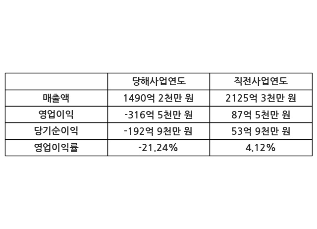 이번사업연도의 매출액은 직전사업연도 대비 -29.88% 감소한 1490억 2천만 원, 영업이익은 -316억 5천만 원, 당기순이익은 -192억 9천만 원이라고 공시했다.