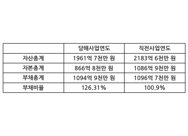 또한, 이번사업연도의 자산총계는 1961억 7천만 원으로 직전사업연도 대비 -10.16% 감소한 한편, 부채총계는 1094억 9천만 원으로 -0.17% 감소, 자본총계는 866억 8천만 원으로 -20.25% 감소했다.