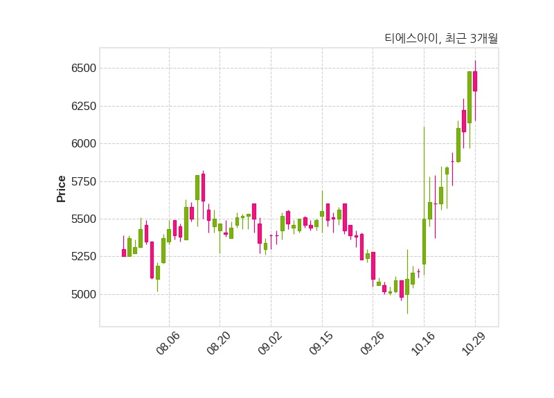 한편, 티에스아이의 14시 00분 현재주가는 6,350원으로 직전 거래일 대비 130원(-2.01%) 하락이며, 거래량은 276,806주이다.