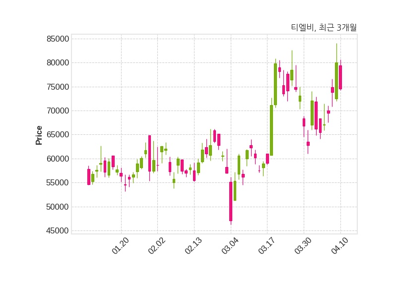 한편, 티엘비는 장 마감 이후 해당 기업공시를 발표했으며 오늘 종가가 74,500원, 거래량은 409,517주로, 직전 거래일 대비 5,500원(-6.88%) 하락했다.