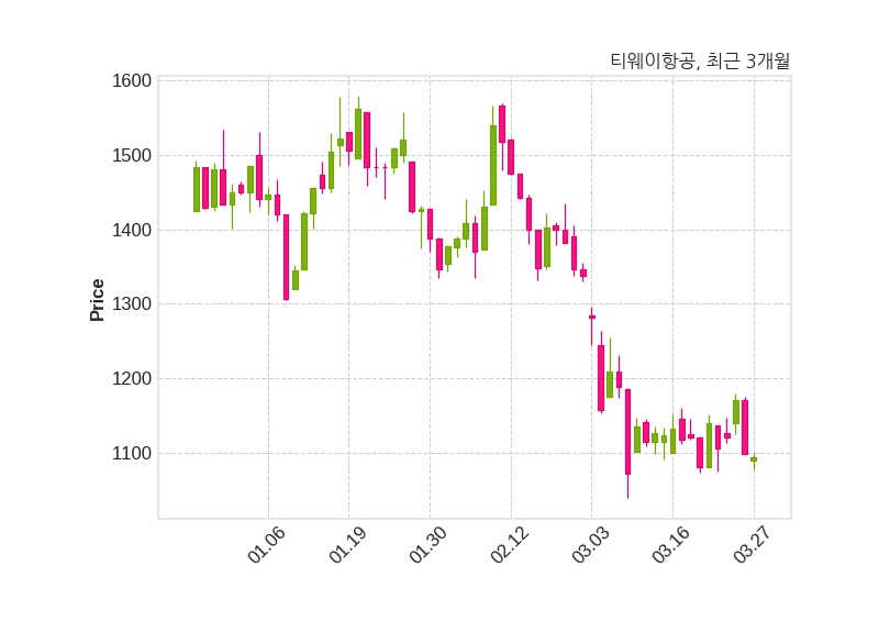 한편, 티웨이항공의 10시 49분 현재주가는 1,094원으로 직전 거래일 대비 5원(-0.45%) 하락이며, 거래량은 185,331주이다.