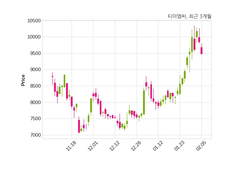 한편, 티이엠씨는 장 마감 이후 해당 기업공시를 발표했으며 오늘 종가가 9,480원, 거래량은 319,153주로, 직전 거래일 대비 370원(-3.76%) 하락했다.