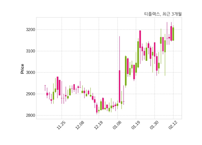 한편, 티플랙스는 장 마감 이후 해당 기업공시를 발표했으며 오늘 종가가 3,210원, 거래량은 208,569주로, 직전 거래일 대비 60원(+1.9%) 상승했다.