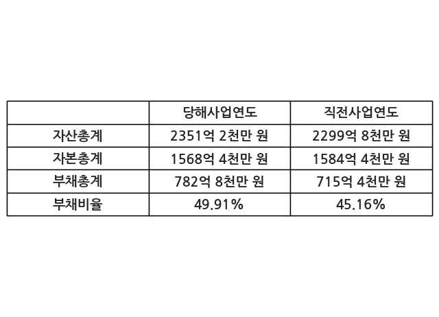 또한, 이번사업연도의 자산총계는 2351억 2천만 원으로 직전사업연도 대비 2.23% 증가한 한편, 부채총계는 782억 8천만 원으로 9.41% 증가, 자본총계는 1568억 4천만 원으로 -1.01% 감소했다.