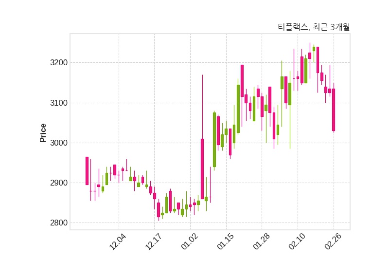 한편, 티플랙스는 장 마감 이후 해당 기업공시를 발표했으며 오늘 종가가 3,030원, 거래량은 195,682주로, 직전 거래일 대비 95원(-3.04%) 하락했다.