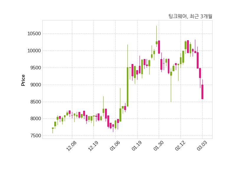 한편, 팅크웨어는 장 마감 이후 해당 기업공시를 발표했으며 오늘 종가가 8,580원, 거래량은 95,159주로, 직전 거래일 대비 620원(-6.74%) 하락했다.