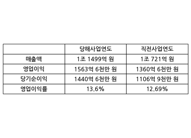 이번사업연도의 매출액은 직전사업연도 대비 7.25% 증가한 1조 1499억 원, 영업이익은 1563억 6천만 원, 당기순이익은 1440억 6천만 원이라고 공시했다.