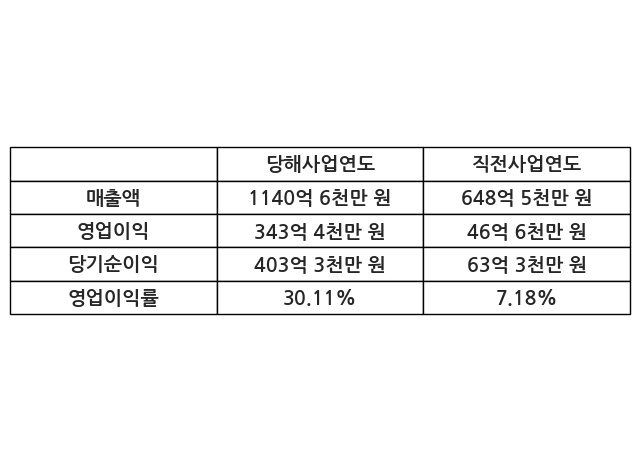 이번사업연도의 매출액은 직전사업연도 대비 75.88% 증가한 1140억 6천만 원, 영업이익은 343억 4천만 원, 당기순이익은 403억 3천만 원이라고 공시했다.