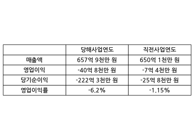 이번사업연도의 매출액은 직전사업연도 대비 1.21% 증가한 657억 9천만 원, 영업이익은 -40억 8천만 원, 당기순이익은 -222억 3천만 원이라고 공시했다.