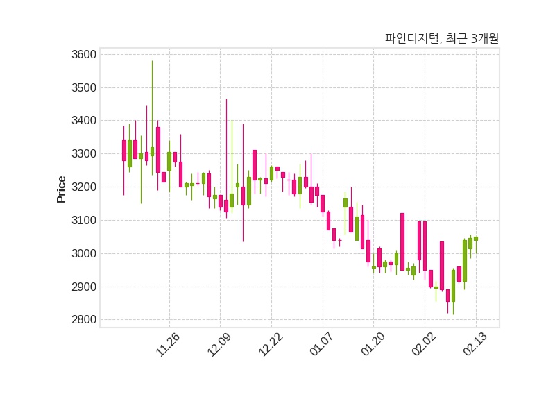 한편, 파인디지털은 장 마감 이후 해당 기업공시를 발표했으며 오늘 종가가 3,050원, 거래량은 3,502주로, 직전 거래일 대비 5원(+0.16%) 상승했다.