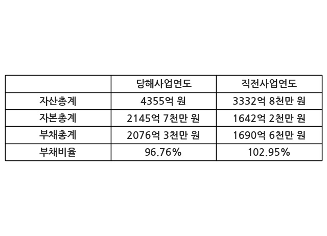 또한, 이번사업연도의 자산총계는 4355억 원으로 직전사업연도 대비 30.67% 증가한 한편, 부채총계는 2076억 3천만 원으로 22.81% 증가, 자본총계는 2145억 7천만 원으로 30.66% 증가했다.