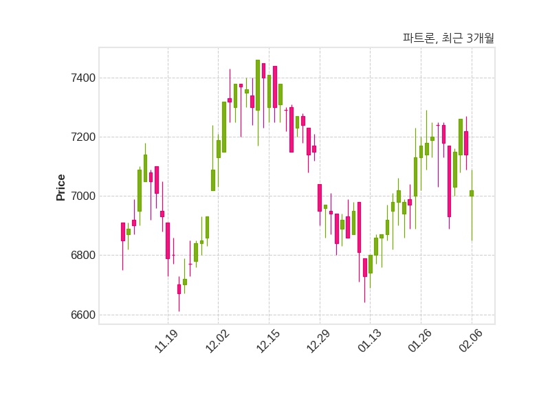한편, 파트론은 장 마감 이후 해당 기업공시를 발표했으며 오늘 종가가 7,020원, 거래량은 260,734주로, 직전 거래일 대비 120원(-1.68%) 하락했다.