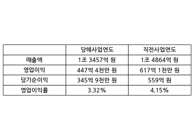 이번사업연도의 매출액은 직전사업연도 대비 -9.47% 감소한 1조 3457억 원, 영업이익은 447억 4천만 원, 당기순이익은 345억 9천만 원이라고 공시했다.