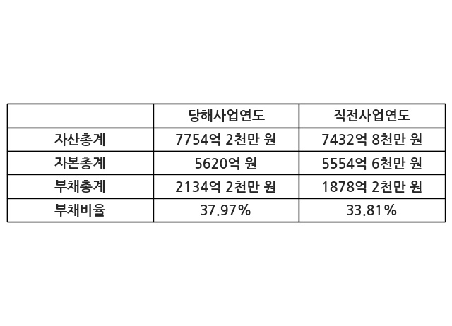 또한, 이번사업연도의 자산총계는 7754억 2천만 원으로 직전사업연도 대비 4.32% 증가한 한편, 부채총계는 2134억 2천만 원으로 13.63% 증가, 자본총계는 5620억 원으로 1.18% 증가했다.