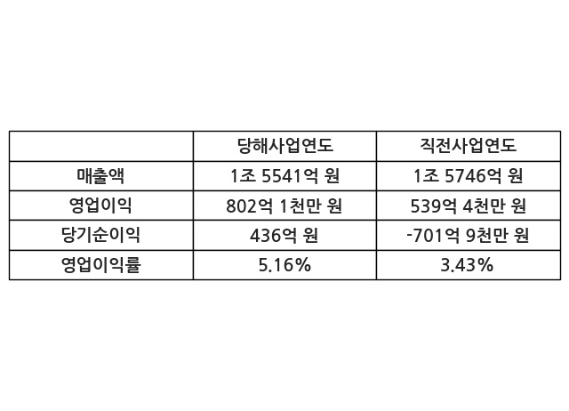 이번사업연도의 매출액은 직전사업연도 대비 -1.3% 감소한 1조 5541억 원, 영업이익은 802억 1천만 원, 당기순이익은 436억 원이라고 공시했다.