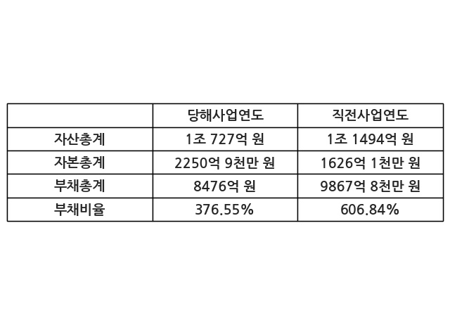 또한, 이번사업연도의 자산총계는 1조 727억 원으로 직전사업연도 대비 -6.67% 감소한 한편, 부채총계는 8476억 원으로 -14.1% 감소, 자본총계는 2250억 9천만 원으로 38.43% 증가했다.