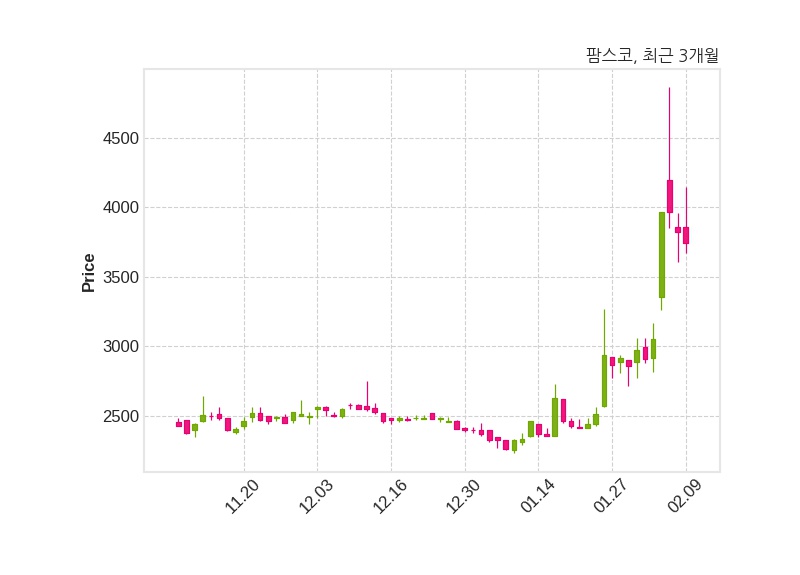 한편, 팜스코는 장 마감 이후 해당 기업공시를 발표했으며 오늘 종가가 3,745원, 거래량은 503,713주로, 직전 거래일 대비 75원(-1.96%) 하락했다.