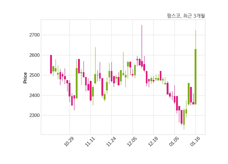 한편, 팜스코는 장 마감 이후 해당 기업공시를 발표했으며 오늘 종가가 2,630원, 거래량은 354,320주로, 직전 거래일 대비 275원(+11.68%) 상승했다.