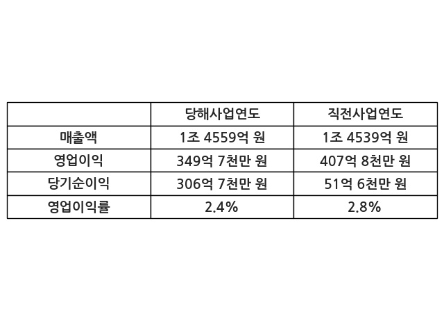 이번사업연도의 매출액은 직전사업연도 대비 0.13% 증가한 1조 4559억 원, 영업이익은 349억 7천만 원, 당기순이익은 306억 7천만 원이라고 공시했다.
