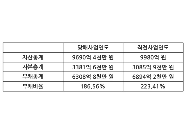 또한, 이번사업연도의 자산총계는 9690억 4천만 원으로 직전사업연도 대비 -2.9% 감소한 한편, 부채총계는 6308억 8천만 원으로 -8.49% 감소, 자본총계는 3381억 6천만 원으로 9.58% 증가했다.