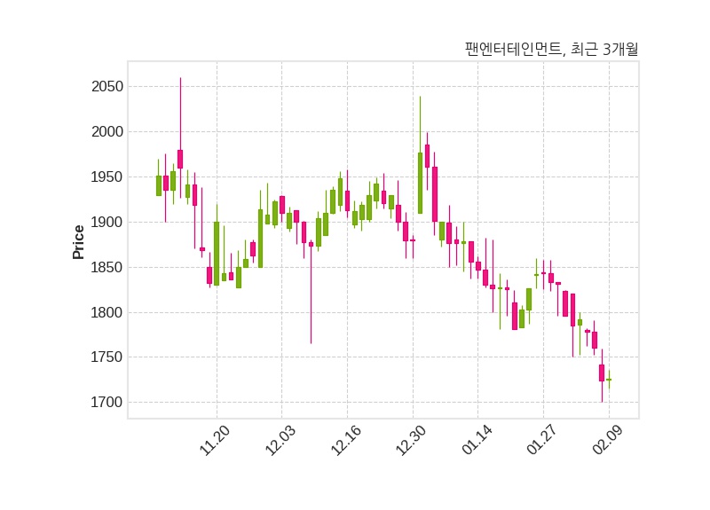 한편, 팬엔터테인먼트는 장 마감 이후 해당 기업공시를 발표했으며 오늘 종가가 1,726원, 거래량은 51,313주로, 직전 거래일 대비 2원(+0.12%) 상승했다.