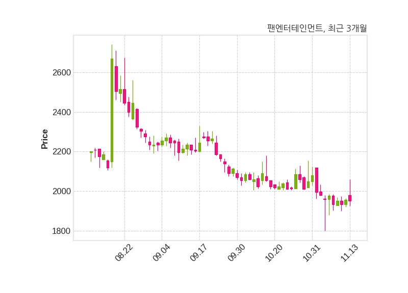 한편, 팬엔터테인먼트의 15시 01분 현재주가는 1,952원으로 직전 거래일 대비 4원(-0.2%) 하락이며, 거래량은 255,953주이다.