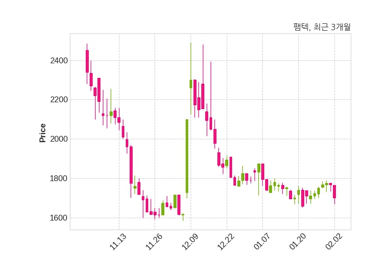 한편, 팸텍은 장 마감 이후 해당 기업공시를 발표했으며 오늘 종가가 1,700원, 거래량은 225,715주로, 직전 거래일 대비 68원(-3.85%) 하락했다.