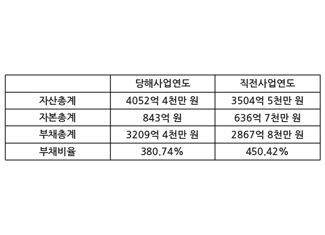 또한, 이번사업연도의 자산총계는 4052억 4천만 원으로 직전사업연도 대비 15.63% 증가한 한편, 부채총계는 3209억 4천만 원으로 11.91% 증가, 자본총계는 843억 원으로 32.39% 증가했다.