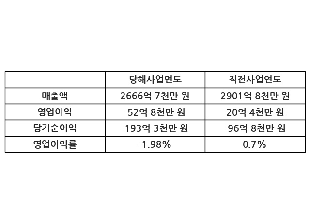 이번사업연도의 매출액은 직전사업연도 대비 -8.1% 감소한 2666억 7천만 원, 영업이익은 -52억 8천만 원, 당기순이익은 -193억 3천만 원이라고 공시했다.