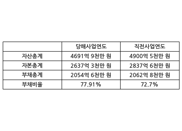 또한, 이번사업연도의 자산총계는 4691억 9천만 원으로 직전사업연도 대비 -4.25% 감소한 한편, 부채총계는 2054억 6천만 원으로 -0.4% 감소, 자본총계는 2637억 3천만 원으로 -7.06% 감소했다.