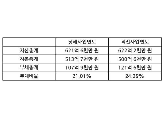 또한, 이번사업연도의 자산총계는 621억 6천만 원으로 직전사업연도 대비 -0.09% 감소한 한편, 부채총계는 107억 9천만 원으로 -11.24% 감소, 자본총계는 513억 7천만 원으로 2.61% 증가했다.