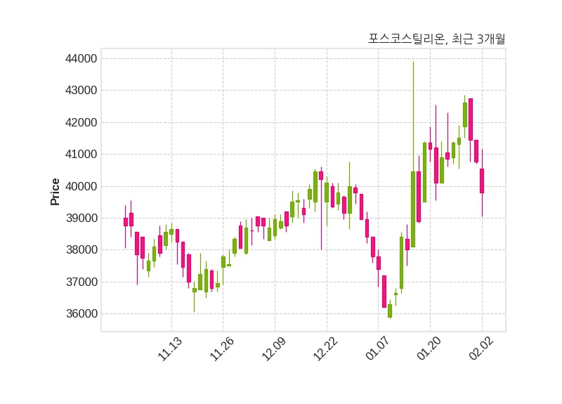 한편, 포스코스틸리온은 장 마감 이후 해당 기업공시를 발표했으며 오늘 종가가 39,800원, 거래량은 29,611주로, 직전 거래일 대비 950원(-2.33%) 하락했다.