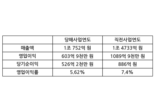 이번사업연도의 매출액은 직전사업연도 대비 -27.02% 감소한 1조 752억 원, 영업이익은 603억 9천만 원, 당기순이익은 526억 2천만 원이라고 공시했다.