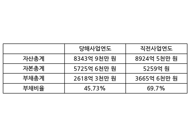 또한, 이번사업연도의 자산총계는 8343억 9천만 원으로 직전사업연도 대비 -6.51% 감소한 한편, 부채총계는 2618억 3천만 원으로 -28.57% 감소, 자본총계는 5725억 6천만 원으로 8.87% 증가했다.