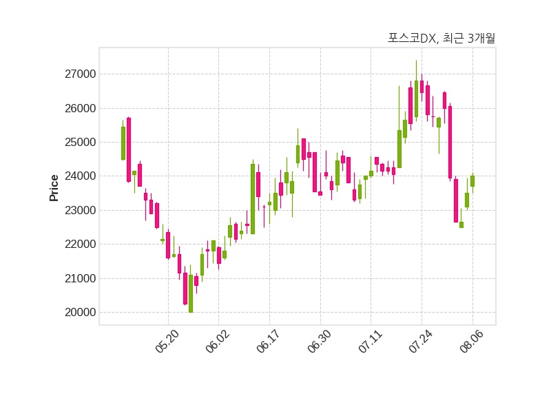 한편, 포스코DX은 장 마감 이후 해당 기업공시를 발표했으며 오늘 종가가 24,000원, 거래량은 253,791주로, 직전 거래일 대비 500원(+2.13%) 상승했다.