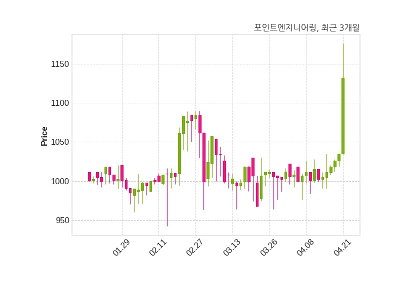 한편, 포인트엔지니어링은 장 마감 이후 해당 기업공시를 발표했으며 오늘 종가가 1,132원, 거래량은 914,568주로, 직전 거래일 대비 97원(+9.37%) 상승했다.