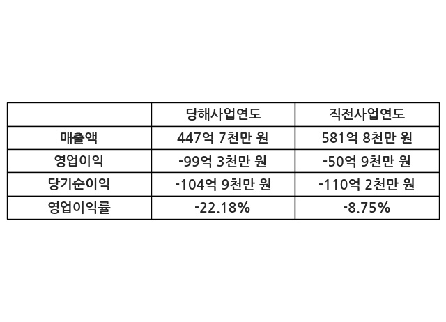 이번사업연도의 매출액은 직전사업연도 대비 -23.06% 감소한 447억 7천만 원, 영업이익은 -99억 3천만 원, 당기순이익은 -104억 9천만 원이라고 공시했다.