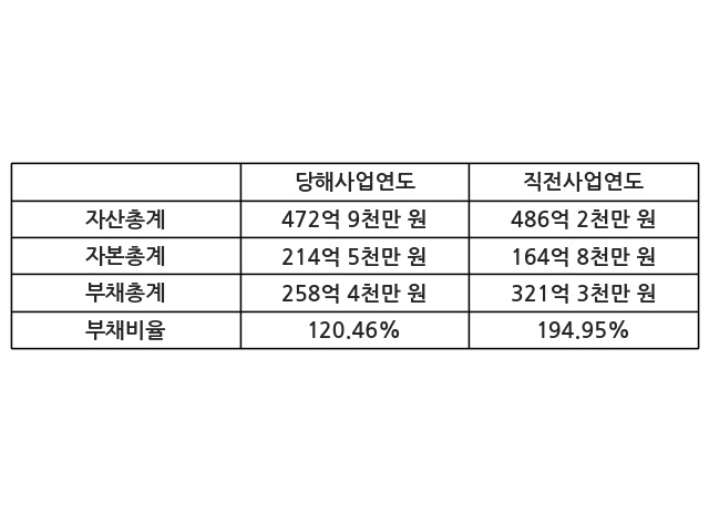 또한, 이번사업연도의 자산총계는 472억 9천만 원으로 직전사업연도 대비 -2.73% 감소한 한편, 부채총계는 258억 4천만 원으로 -19.58% 감소, 자본총계는 214억 5천만 원으로 30.14% 증가했다.