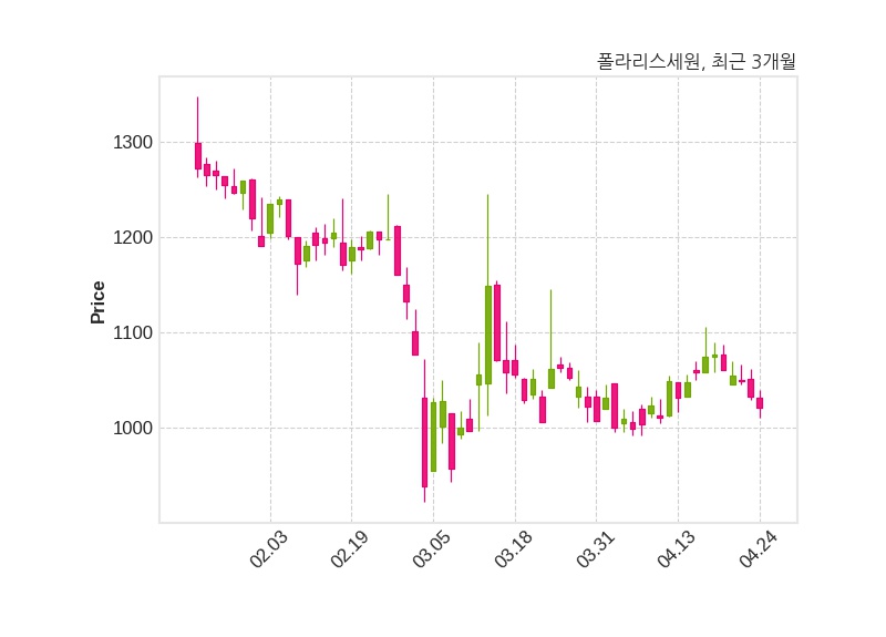 한편, 폴라리스세원은 장 마감 이후 해당 기업공시를 발표했으며 오늘 종가가 1,021원, 거래량은 489,101주로, 직전 거래일 대비 11원(-1.07%) 하락했다.