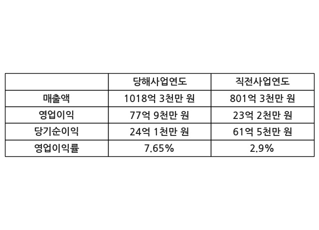 이번사업연도의 매출액은 직전사업연도 대비 27.07% 증가한 1018억 3천만 원, 영업이익은 77억 9천만 원, 당기순이익은 24억 1천만 원이라고 공시했다.