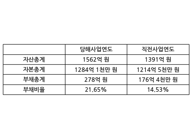 또한, 이번사업연도의 자산총계는 1562억 원으로 직전사업연도 대비 12.3% 증가한 한편, 부채총계는 278억 원으로 57.54% 증가, 자본총계는 1284억 1천만 원으로 5.73% 증가했다.