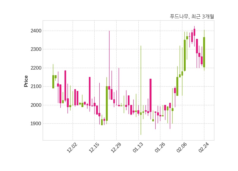 한편, 푸드나무는 장 마감 이후 해당 기업공시를 발표했으며 오늘 종가가 2,365원, 거래량은 42,373주로, 직전 거래일 대비 145원(+6.53%) 상승했다.