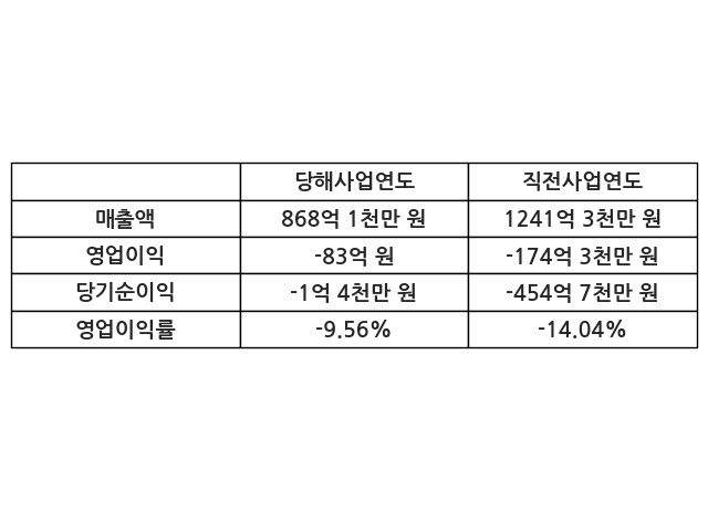 이번사업연도의 매출액은 직전사업연도 대비 -30.07% 감소한 868억 1천만 원, 영업이익은 -83억 원, 당기순이익은 -1억 4천만 원이라고 공시했다.