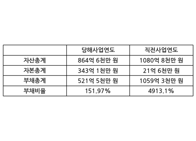 또한, 이번사업연도의 자산총계는 864억 6천만 원으로 직전사업연도 대비 -20.0% 감소한 한편, 부채총계는 521억 5천만 원으로 -50.77% 감소, 자본총계는 343억 1천만 원으로 1491.58% 증가했다.