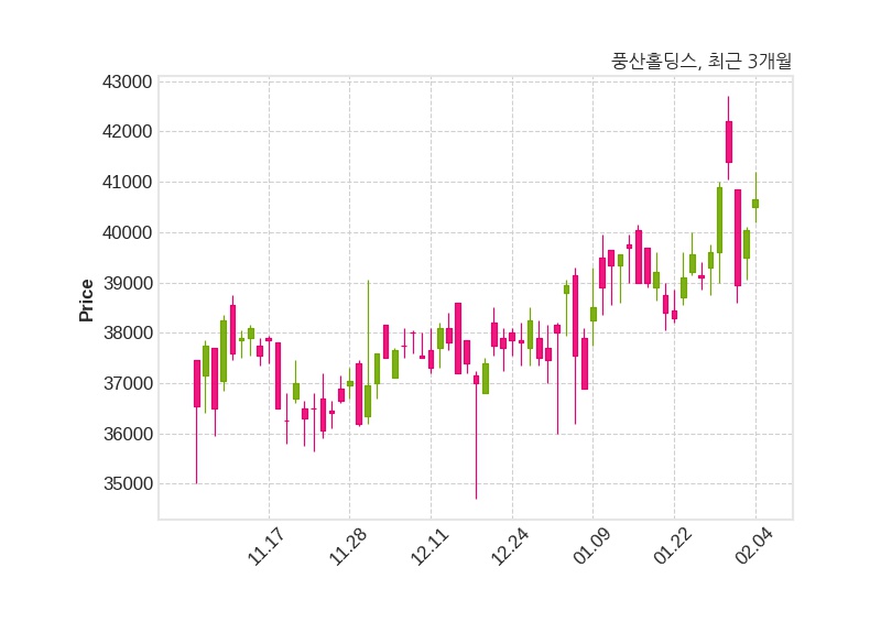 한편, 풍산홀딩스는 장 마감 이후 해당 기업공시를 발표했으며 오늘 종가가 40,650원, 거래량은 26,008주로, 직전 거래일 대비 600원(+1.5%) 상승했다.