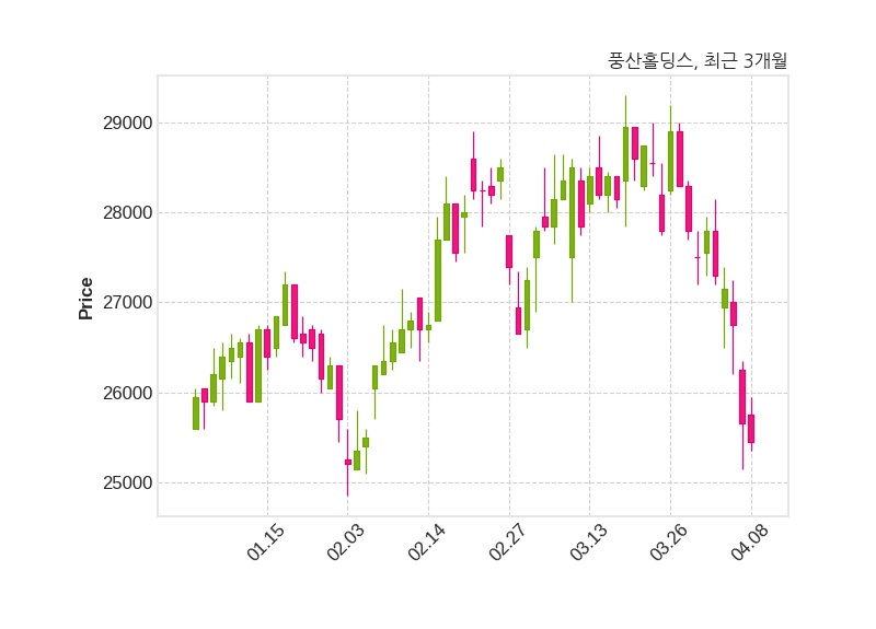 풍산홀딩스는 특별관계자 브이아이피자산운용의 지분율이 11.83%에서 10.79%로 변동했다고 08일 공시했다. 한편, 풍산홀딩스의 10시 00분 현재주가는 25,450원으로 직전 거래일 대비 200원(-0.78%) 하락이며, 거래량은 11,821주이다.