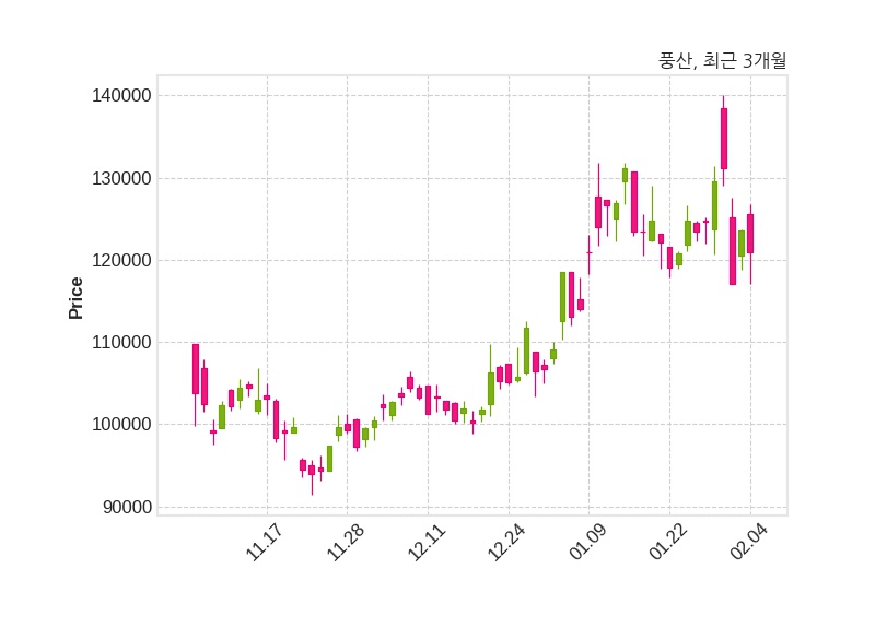 한편, 풍산은 장 마감 이후 해당 기업공시를 발표했으며 오늘 종가가 120,900원, 거래량은 472,116주로, 직전 거래일 대비 2,700원(-2.18%) 하락했다.